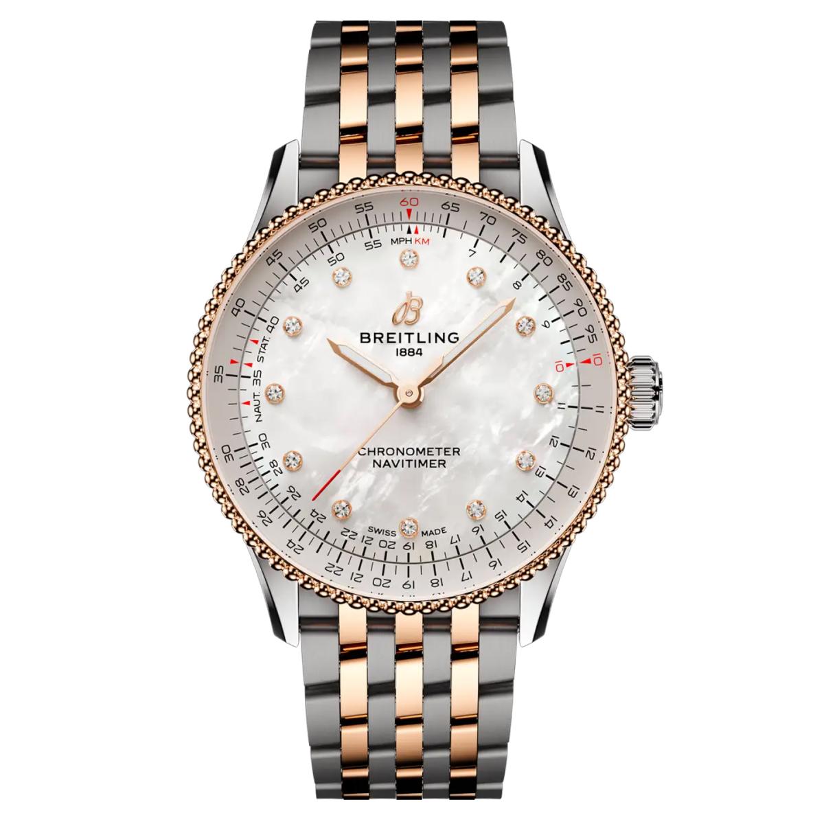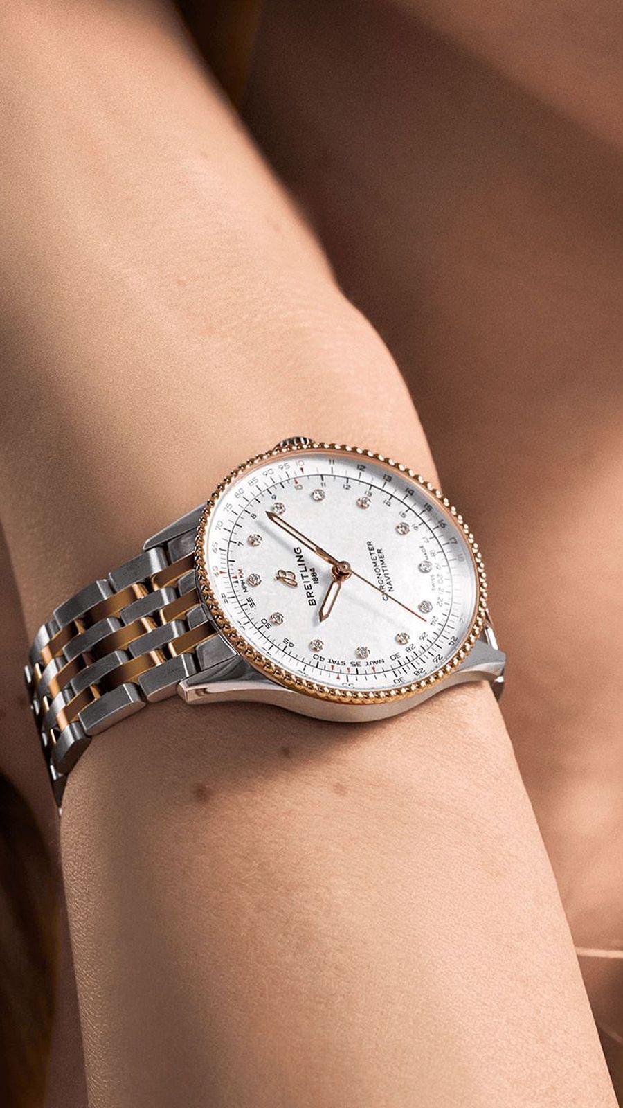 Breitling’s icon—for the journey. The Navitimer is one of the most recognizable watches ever made. It’s on collectors’ lists of the greatest watches of all time. What began in 1952 as a tool for pilots has gone on to mean something profound to every single person who has had this timepiece along on their personal journey. Our icon now comes in 36 and 32 mm sizes for women and men who love the look and feel of a smaller diameter watch. While the 36-mm Navitimer features the beaded bezel and iconic circular slide rule that gives the Navitimer its unmistakable appearance, the dazzling 32 mm variation forgoes the slide rule in favor of a simplified dial design suited to its slim diameter. But these showstoppers have so much more to offer than just their trim new sizes. Pops of pastel, mother of pearl, and traceable precious materials combine with subtle refine