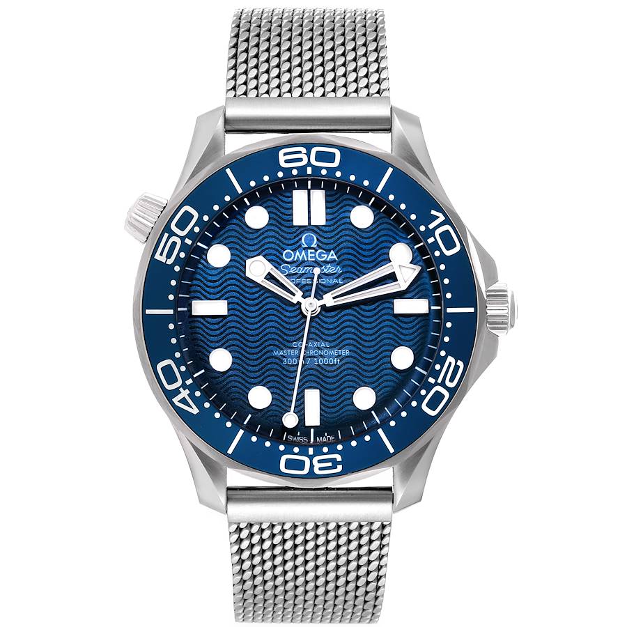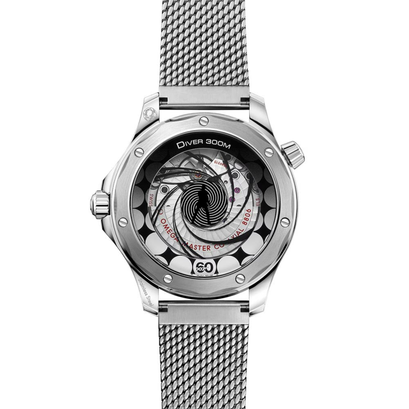 Pristatytas 2022 m., minint 60-ąjaus Džeimso Bondo metines, šis 42 mm „Seamaster Diver 300M“ laikrodis iš nerūdijančio plieno turi mėlyną oksalinio anodo aliuminio ciferblatą su lazeriu graviravimo šiuo metu trijuose trijuose bangomis, įkvėptą „Seamaster Diver 300M“. skalėje.